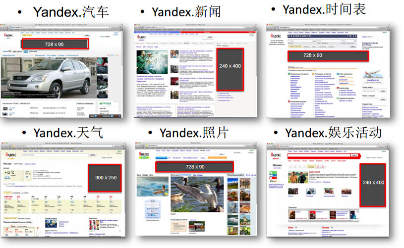◆ 主題廣告(Yandex廣告聯(lián)盟) Yandex廣告聯(lián)盟的廣告主要出現(xiàn)在與Yandex合作的各種網(wǎng) 站的網(wǎng)頁(yè)上,且能根據(jù)不同網(wǎng)站的主題和用戶(hù)的搜索行為對(duì) 廣告進(jìn)行展示。目前,Yandex廣告聯(lián)盟的日訪(fǎng)問(wèn)量已近150 0萬(wàn)人。